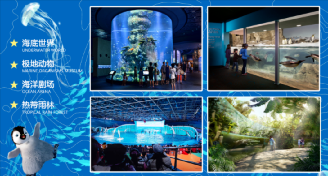 十大主题展示区:热带海洋、黄金海岸、梦幻水母、美人鱼剧场、海底漫步、魔幻光影、海豚剧场、冰极天地、雨林探险、科普学院。