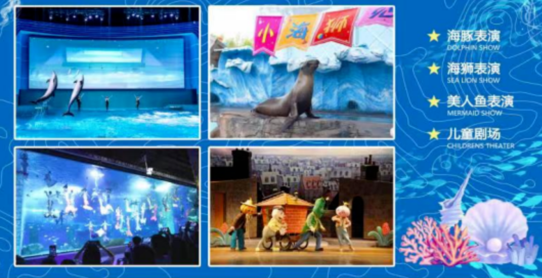四大主题表演:海豚表演、海狮表演、水下美人鱼表演、儿童剧表演。